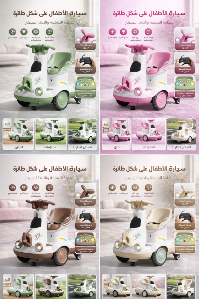 سيارة أطفال كهربائية بتصميم طائرة مميز مع دوران 360° وتحكم أبوي كامل لراحة وأمان أكبر. مزودة بمحرك مزدوج، أضواء LED، وموسيقى تفاعلية تمنح طفلك تجربة ممتعة وآمنة.